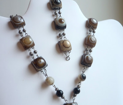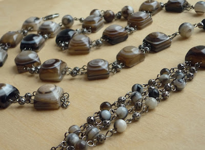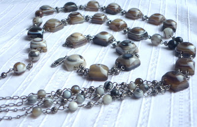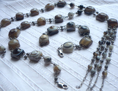 Эти агаты попались мне год назад, когда я еще даже не думала, что буду делать украшения не для себя. Они кажутся мне похожими на панцирь черепахи и в тоже время ассоциируются с таинственной лесной чащей. С самой первой минуты я знала, как их собрать - строгие, почти офисные, как будто галстук, для белой блузки. А теперь я смотрю на них и мне хочется носить их с джинсами и водолазкой. И ни одно название к ним не подошло.