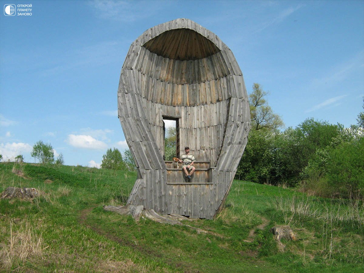 . То, что получилось, производит сильное впечатление. Статичные и подвижные деревянные и металлиxеские конструкции размещены довольно хаотично на огромной территории (берег Угры и близлежащее поле).