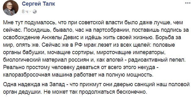 Вот вы смеётесь, когда авторы фильма о плоской Земле выигрывают телевизионные премии, а они скоро будут государственные награды получать, и это уже не очень смешно. Оказывается, когда планомерно погружаешь общество во всю пучину тамплиерских жидомасонских заговоров, то сам потихоньку начинаешь верить в протоколы сионских мудрецов. То глава совбеза РФ говорит фразами, приписанными Олбрайт диванными конспирологами, потом генерал из ФСО рассказывает, как чекисты сканировали мысли этой влиятельной старушки, то Медведев рассуждает об искусственном интеллекте, который захватит власть, заменит нам все органы и нажмёт delete. А вчера Путин сказал вообще великое: иностранцы собирают биоматериалы россиян. То есть, буквально, президент ядерной державы говорит, что американцы (а кто же ещё?) собирают лобковые волосы жителей Саратова! Едешь ты в середине августа с дачи, трясёшься в набитой маршрутке и вдруг чувствуешь, как кто-то о твою подмышку трется, а это шпиён иностранный биоматериал собирает ЧТОБЫ СОЗДАТЬ ИСКУССТВЕННЫЙ ИНТЕЛЛЕКТ ЗАМЕНИТЬ НАМ ОРГАНЫ И НАЖАТЬ DELETE! Сначала ты создаёшь условное РЕН ТВ с рептилоидами, а потом эти рептилоиды с РЕН ТВ создают тебя. Поэтому, когда вы в очередной раз увидите фильм, рассказывающий, что Wi-Fi сети увеличивают рождаемость детей-геев, то перед тем, как орать, задумайтесь о том, что на основе подобных теорий первые лица страны принимают свои решения
