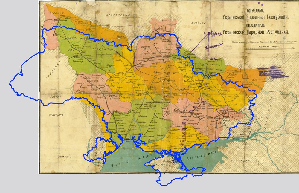 Мапа Української Народної Республіки 1918 року та сучасні кордони України