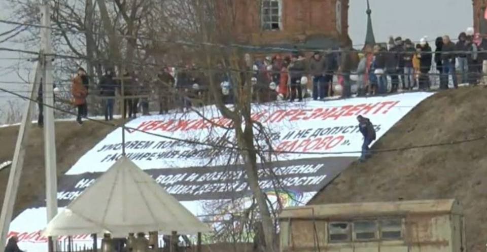 Жители Волоколамска с шариками и челобитными царю протестуют против свалки под песню "Священая война".