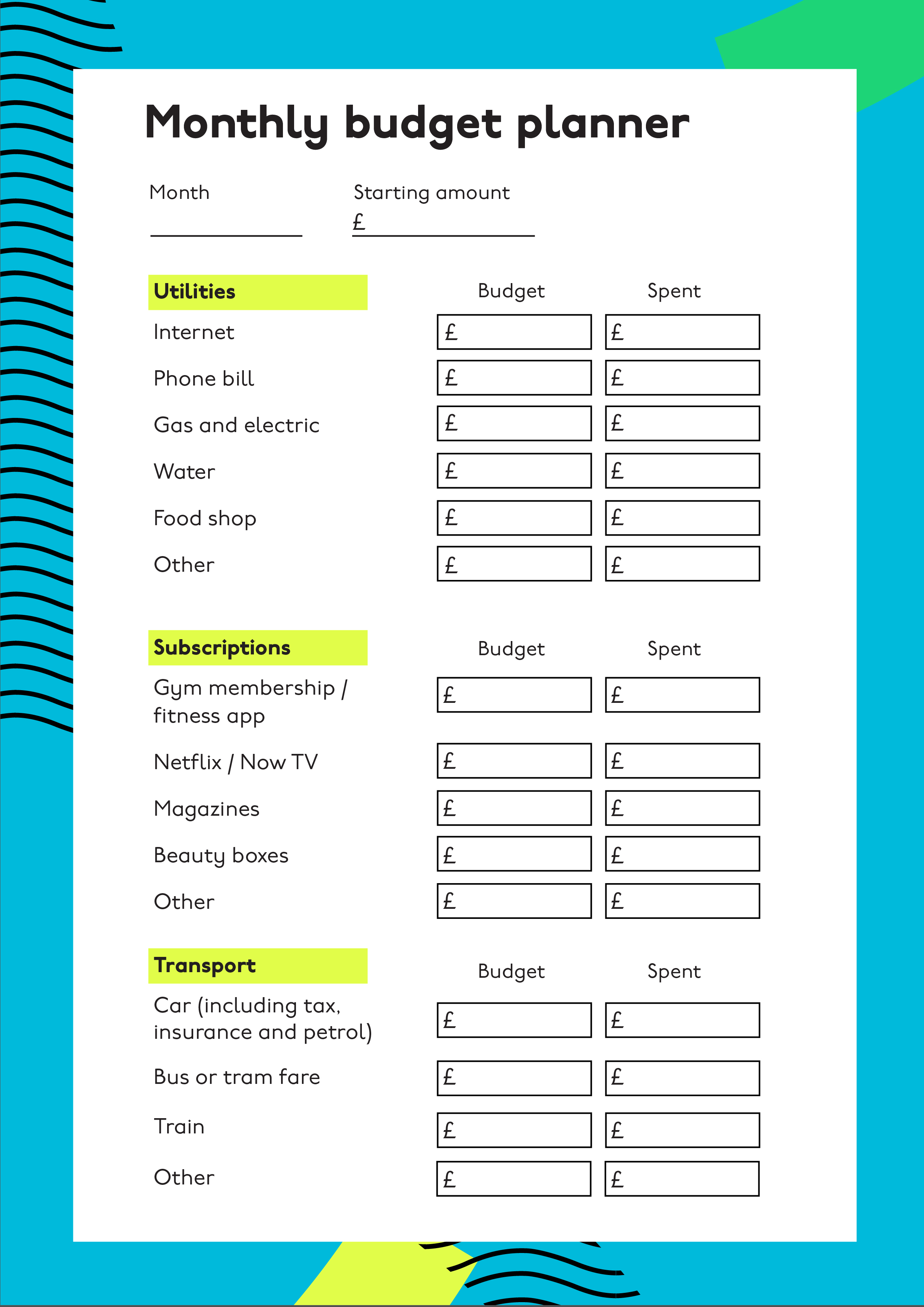 Есть вот такая таблица (в формате jpeg) для планирования бюджета. Как сделать так, чтобы в левой колонке, где Utilities, Subscriptions и Transport у меня были просто линиии, где я могу написать что-то сама (вместо Phone bill, Food Shop, etc)? Мне в голову приходит только замазать белым в условном пеинте и нарисовать линии самой, но получается не очень красиво.